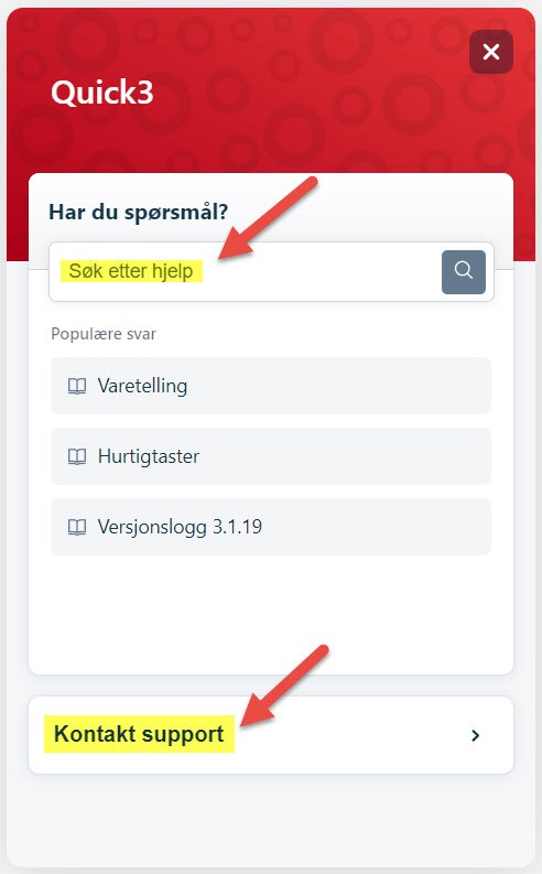 Bruk "Be om hjelp" -knappen som finnes i toppmenyen i Quick3. Der kan du søke i brukerveiledningen. Skriv noen stikkord relatert til spørsmålet ditt, så får du et forslag til relevante artikler. Kanskje finner du svaret på spørsmålet ditt allerede der.Bruk "Kontakt support" skjemaet. Angi tema slik at vi raskt kan rute saken til konsulenten med den riktige kompetansen hos oss. Skriv spørsmålet ditt så utfyllende som mulig, med relevante eksempler. Legg gjerne med et skjermbilde hvis det bidrar til å underbygge spørsmålet ditt. Hvis det er tilstrekkelig med informasjon i spørsmålet kan vi som oftest hjelpe deg uten å stille oppfølgingsspørsmål tilbake. Det gir tid spart både for deg og oss.